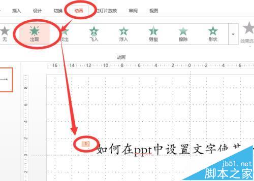 2、选中以后点击上方工具栏中的的【动画】,然后点击动画效果【出现】,这时选中的文字就会在左上角出现数字角标,这就意味着选中的文字已经有了基本的动画。如图所示。