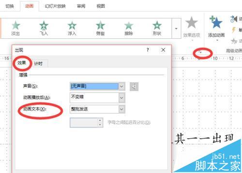 3、然后在【效果选项】一栏的右下角有一个小箭头,点击之后即会出现新的界面,点击【效果】,在效果这一页中选择【动画文本】,如图所示。