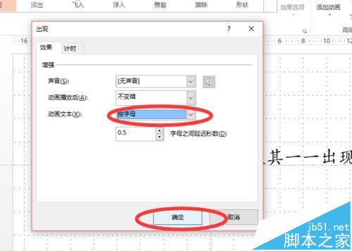 4、在【动画文本】一栏中,选择【按字母】,同时在下方还可以设置每个字母间出现的间断时长,然后点击确定。之后选中的文字即可出现打印机效果啦。如图所示。