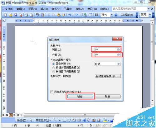 2、在打开的插入表格的窗口,更改列数为18列,行数为18行,然后单击“确定”。