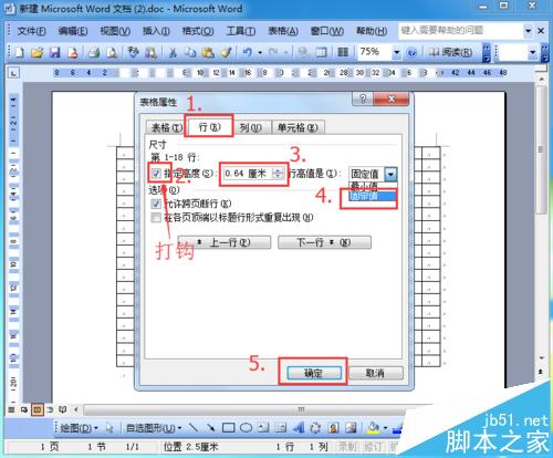 4、在打开的表格属性窗口,点击“行”,在指定高度前面打钩,然后更改行高数据为0.64厘米,行高值设为“固定值”,同理点击列,设置列宽数据为0.64厘米,点击“确定”