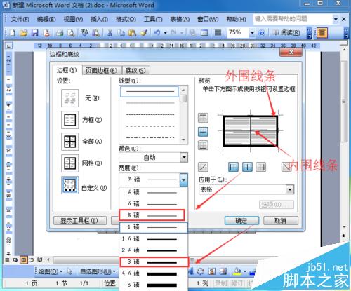 6、先把外围边框改为粗线,点击“宽度”,如选择3磅,然后在预览图点击外围四周设置边框。 内围十字型线条也设置下宽度,如选择0.5磅,然后依次点击加上线条