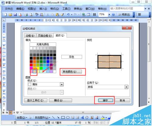7、设置线条粗细之后,为棋牌表格添加底纹颜色,点击“底纹”,选择一种颜色(如茶色),或者更多颜色选择点击其他颜色也可,然后点击“确定”