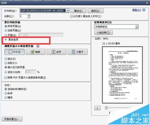 3、选择好打印机,和打印的方向是纵向还是横向。然后点击“更多选项“