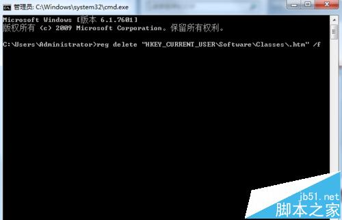 2、然后在命令行输入【reg delete "HKEY_CURRENT_USER\Software\Classes\.htm" /f】,点击确定删除错误的项,问题解决