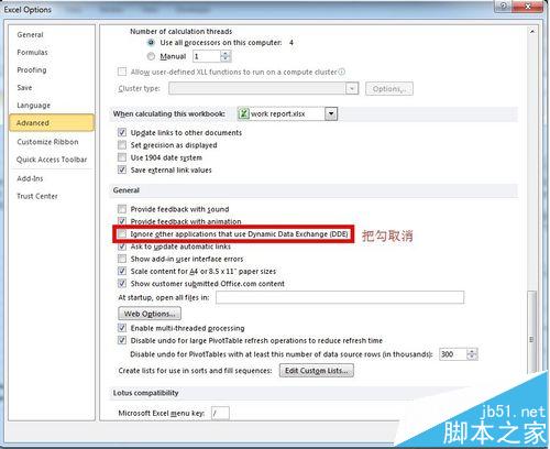 3、单击“高级”后,在右侧区域找到“常规”,将“忽略其他使用动态数据交换 (DDE) 的应用程序”的勾取消,确定后重新开启Excel2010即可。