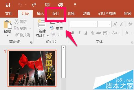 1、打开演示文稿,单击“设计”选项在如图中的位置所示。