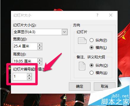 4、打开”幻灯片大小“对话框,在”幻灯片编号起始值“数值框中直接输入起始编号”5“,也可以通过数值框右侧的调节按钮进行调节,然后单击”确定“按钮即可。