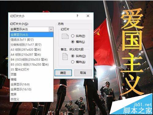 2、单击”设计“选项卡中”幻灯片大小“选项组中的”自定义幻灯片大小“按钮。打开”幻灯片大小对话框“,在”方向“区域中选中”幻灯片“下的”纵向“单选按钮,然后点击”确定”按钮即可。
