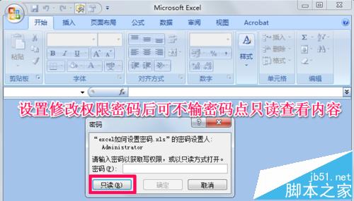 6、这里解释一下,打开权限密码和方法一中是一样的,就是你打开时就必须输入密码才能看到内容;而设置修改权限密码后你可以不用密码选择用只读的方式打开查看内容,想要修改就必须输入密码。
