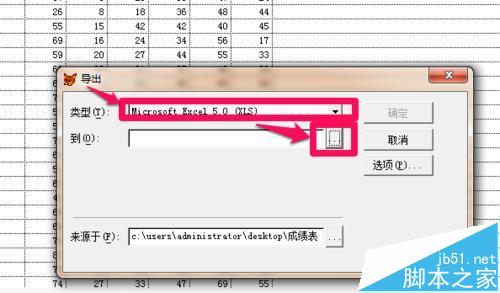 3、在类型里选择”Microsoft Excel 5.0(xls)“,在到中选择导出到哪里。