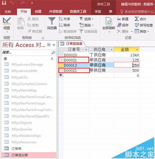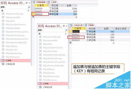 原因二,追加表与被追加表有重复键值。如图,订单表已经存有D0012的订单号记录(第3条记录),而追加表也有这个订单号(也是第3条记录)。