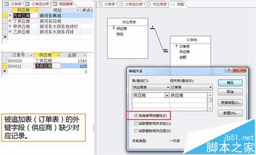 原因三,外键缺少记录。如图,订单表和供应商表设置了关系,供应商表的主键供应商与订单表供应商字段作了关联,实施参照完整性,所以订单表的供应商字段是外键。追加表中有一条含有“戊供应商”的记录,而供应商表没有对应的记录,这也是会造成键值冲突的。