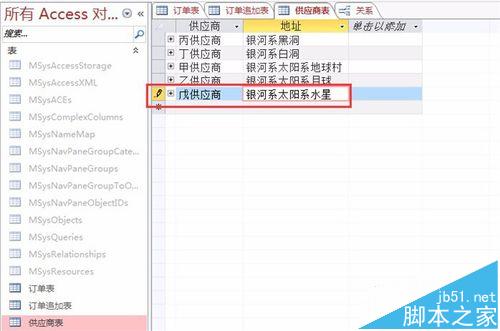 应对三,补值。如图,在供应商表补充“戊供应商”的记录。