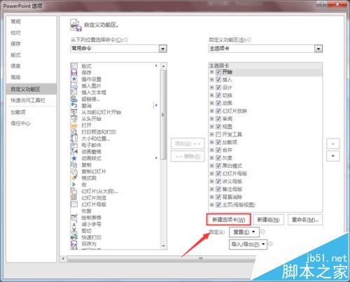 4、我们进入我们的自定义功能区过后,我们可以看到在最下面有一个新建选项卡,这里我们点击这个新建选项卡,然后我们就需要把这几个新建选项卡该名,这里根据大家的好记来设置吧,