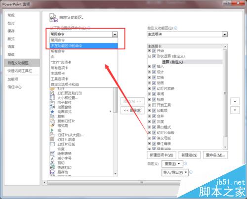 5、然后我们在左边的自定义功能区,然后点击常用命令的下拉框,在这里面我们选择不在功能区的命令,因为我们的形状运算都是在这里面选择的。