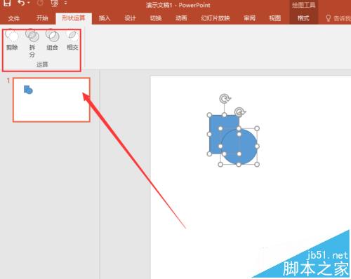 8、这里我们就可以使用我们的形状运算工具了,比如我们在空白幻灯片下画出2个图形,然后我们需要做的就是我们点击我们刚才新建的形状运算,这样我们就可以使用我们的工具了。