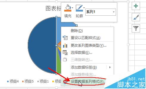 3、表格中已经生成一个饼图,左侧的蓝色图形是汇总结果的数据占比,选中饼图,右击,选择设置数据系列格式