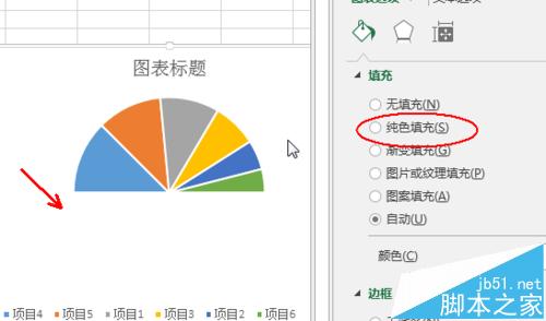 5、对蓝色区域部分单击两次,选中它,在右侧的数据系列格式中,切换到颜色,点选设置填充颜色为纯色填充,在颜色中选择纯白色,这样在白色背景下就看不到下面的部分了,初步显示出半圆饼图了