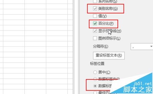 6、选中饼图,在右侧的数据标签设置中,勾选百分比和数据标签,取消值,显示位置在数据标签外,如图所示