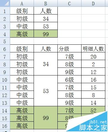 1、现有如下数据,想用饼图来体现各级别的人数情况,同时也想把高级中7-8-9三个级别的明细人员也体现出来,该怎样制作饼图呢?