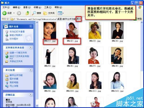1、准备好员工照片,并利用图像处理软件处理成相同大小的,并以员工姓名命名照片,然后将这些文件放于一个文件夹中