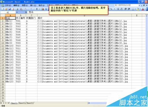 2、将通行证所需要的员工信息录入到EXCEL中,并列出照片的路径,需要注意的是,路径中的"\"要以"\\"代替