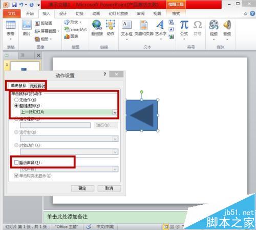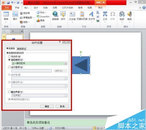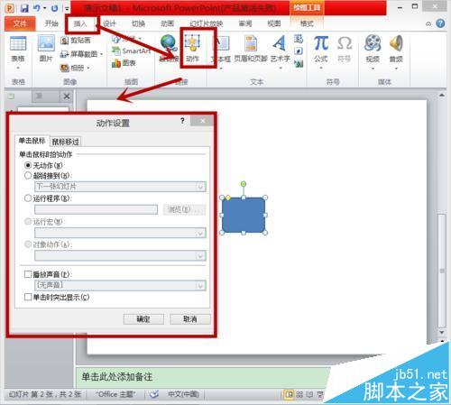 6、同样的,可以选中”圆角矩形“,选择插入里的动作,会出项和刚才动作按钮一样的窗格,所以我们可以通过为图形添加动作的方法来设置动作按钮。