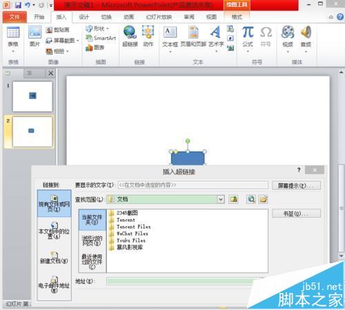4、同样的,我们选择插入一个圆角矩形,然后选择图形——选择插入超链接,会出现如图所示的对话框。