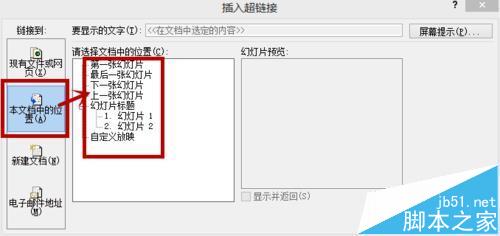 5、最常用的是“本文档中的位置,我们可以连接到其他幻灯片,网页版的PPT就是用这种方法制作的。