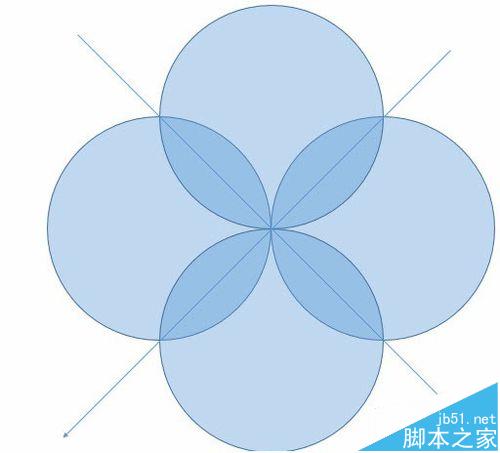 3、接下来本例最关键的步骤,在“插入--形状—直线”中,按住Shift键,可以拖拽出斜45度的直线,并移置(穿过)四个圆的相交点。如下图所示: