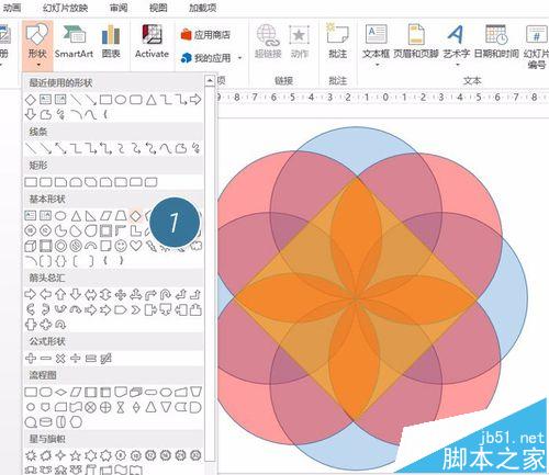 5、最后在叠加一个菱形(下图 1 处),注意四个角与圆形的相交点。如下图黄色区域: