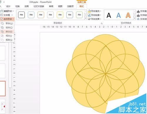 6、接下来Ctrl+A 选中所有的图形,然后点击在“绘图工具-格式-合并形状--拆分”,将图形拆分掉。如下图所示: