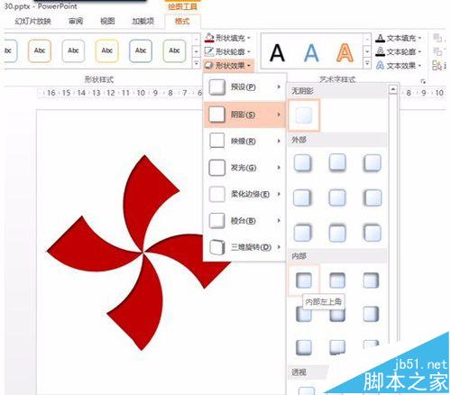 9、最有一步,设置凹进去的倒阴影。选中图形点击“形状效果—阴影—内部”随便选一个阴影搞定。