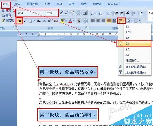 6、选中文字的标题部分(可以按Ctrl键同时单击或者拖拽,选取不同位置的文字),然后单击“开始”,设置文字的大小,字体,和黑体等,然后选择行间距为2.0: