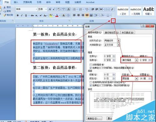 7、选中正文部分,然后单击段落栏的右下角图标,设置首行缩进2字符,和固定值为18磅后,单击“确定”:
