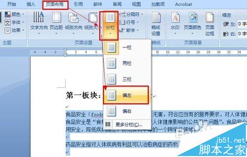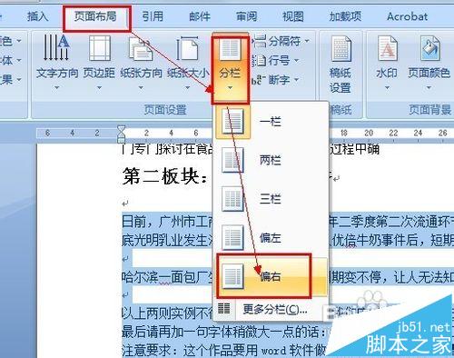 9、将另一部分正文选择“页面布局,分栏,偏右”进行分栏: