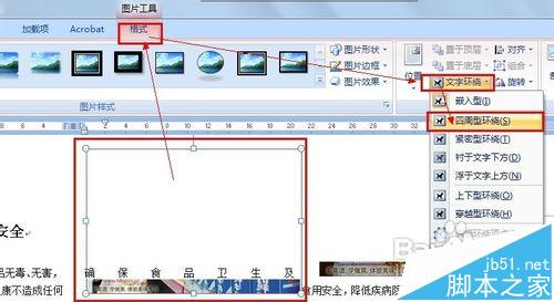 11、选择其中一个图片,然后单击“格式,文字环绕,四周型环绕”。同样的方法设置另一张图片:
