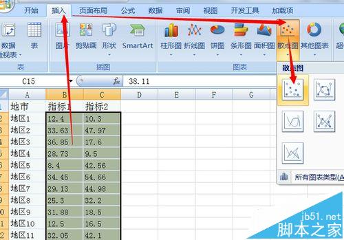 2、选择B:C两列数据,不要带标题部分,插入散点图: