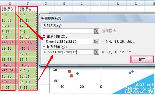 5、分别将E列数据添加到X轴系列值,F列数据添加了Y轴系列值,并单击确定即可,此时原对话框中多出了一个:系列2,点击确定完成数据的添加。