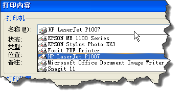 3、在“打印内容”窗口选择好你的黑白打印机名称,我这里选择HP Laserjet P1007.大家根据自己的实际情况选择。