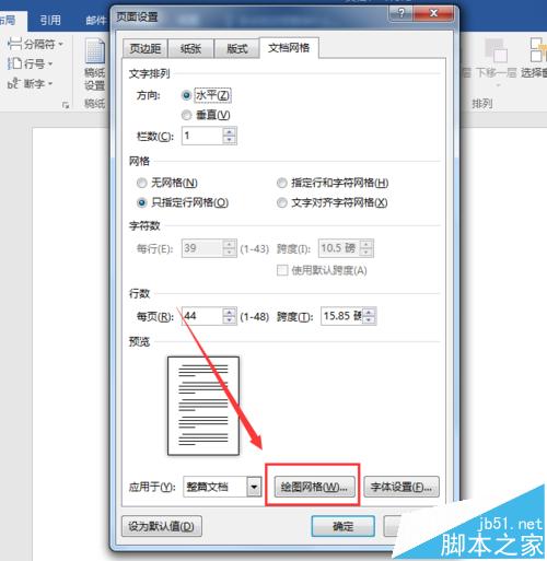 4、我们进入文档网络过后,我们可以看到这里可以文字排列、网络、字符数、行数等等。不过这些都不是我们所需要的,我们这里需要点击的就是绘图网格,也就是在界面的右下方,下图已经标出来了。