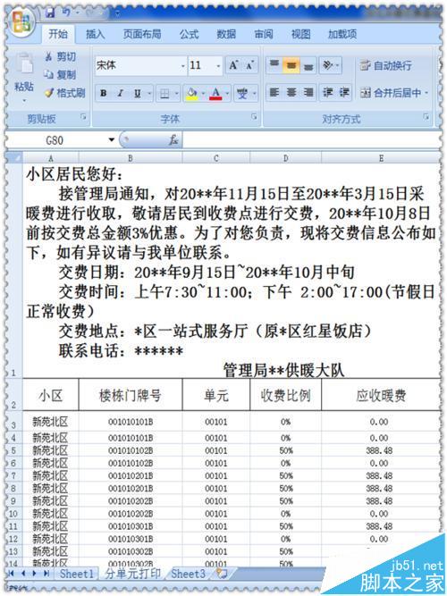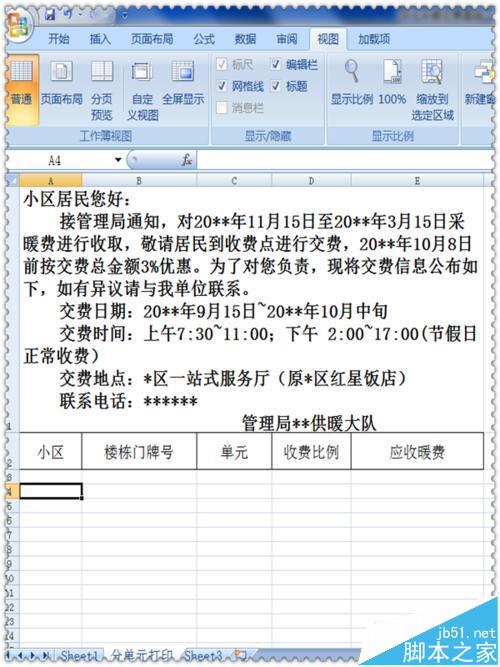 2、在这个工作薄中另建一个工作表,可以起名为“分单元打印”。制作第一行文字,把需要向住户交待的缴费时间、地点等等通知说明都写好,字体格式可以用宋体18号加粗,然后第二行输入“小区名称,楼栋门牌号,单元,收费比例,应收暖费”等项目名称。看图。