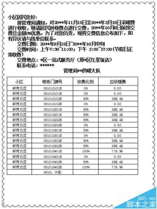 许多社区都管辖着几千或者上万户的居民,如果要收取各项物业费、采暖费或者别的费用,有时是需要把收费明细打印出来,张贴到楼栋门口,方便住户看到明细进行缴纳的。小编经过摸索,找到了一种比较便捷的方法,主要是利用excel“分类汇总”中的“每组数据分页”功能来实现自动分页打印,这样打印也每年为单位节省了几百元的纸张费用,现把此方法与大家分享。
