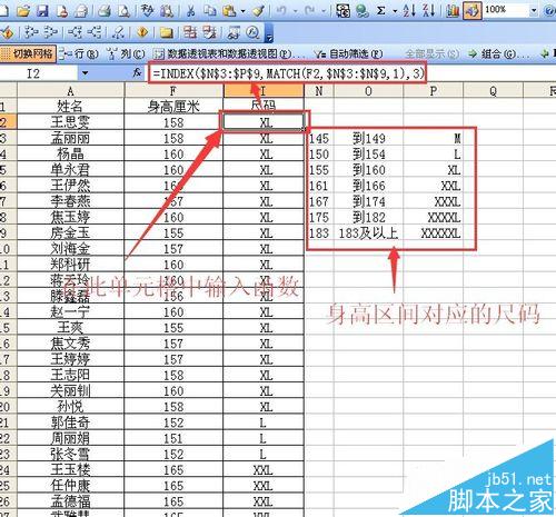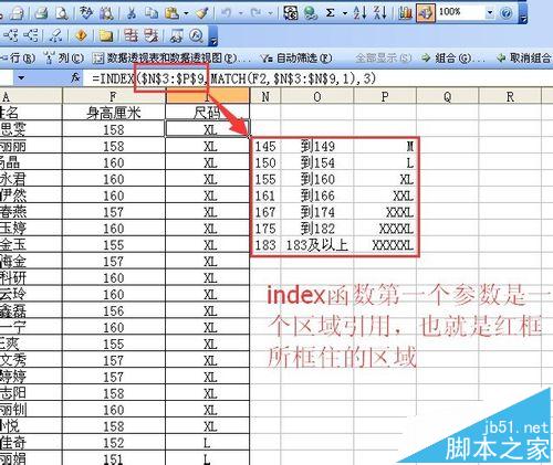 1、如图所示大红框是身高区间对应的尺码,我在单元格中输入了index函数