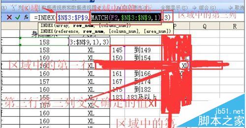2、第一个参数就是身高区间对用的尺码区域,在输入函数的时候用鼠标选中区域引用,然后按f4在区域引用的行标和列标之前加入美元符号,这样改区域就被锁定,无论公式复制到哪里,引用区域不发生变化。