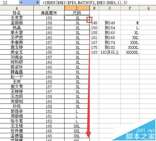 6、拖动小红框所示的填充柄向下复制公式,这样就可以自动计算出身高所对应的尺码了。