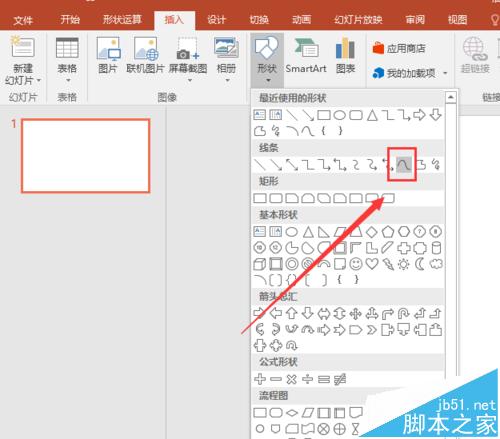 2、首先我们打开我们的PPT软件,这里我使用的是PowerPoint2016,不过制作卷页纸对PowerPoint版本没有要求的。这里我们先点击插入,然后我们找到图形,这里我们再点击曲线,因为我们需要用曲线画出一个大概的边框图形。