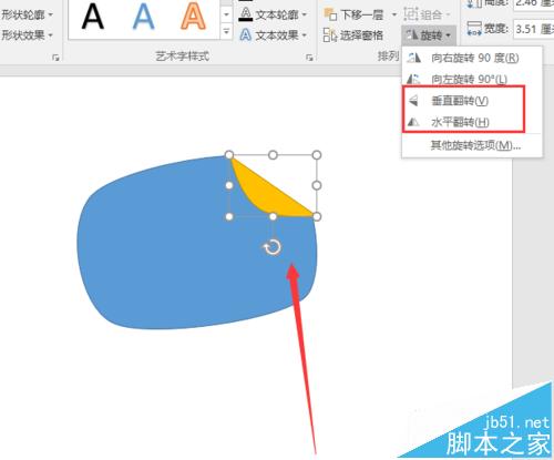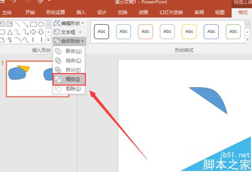 5、然后我们就是对图像就行修改了,这里我们首先需要的卷页纸的卷页图形,这里我们就是选择其中的一个图形,然后选择格式,可以看到在合并形状的下拉框有一个相交选项,这里我们点击这个选项就可以获得下图所示的图形了。