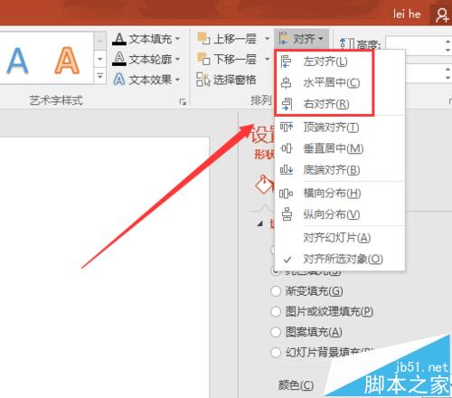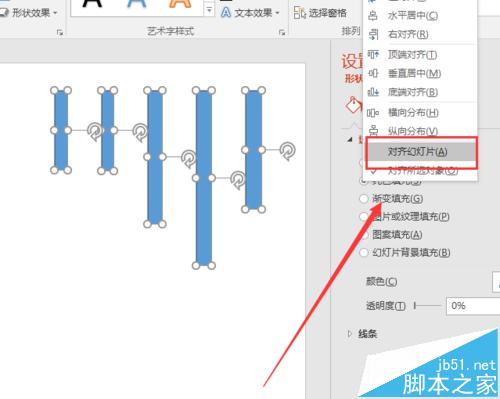 7、最后我们说一下对齐当中的对齐对象吧,这里我们可以看到有2个选项,分别是对幻灯片或者对所选对象。如果是对幻灯片的话,也就是以幻灯片的边界或者中心来确定的,比如顶端对齐,那么会移动到幻灯片的顶端。